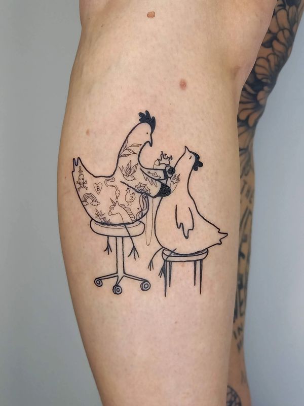 I have a specific style which has a cartoon and graphic novel influence. I usually tattoo plants, houses, nature, animals, the most famous animal I tattoo is Berta, the chicken - as you can see Berta is getting a tattoo on her neck in this picture.